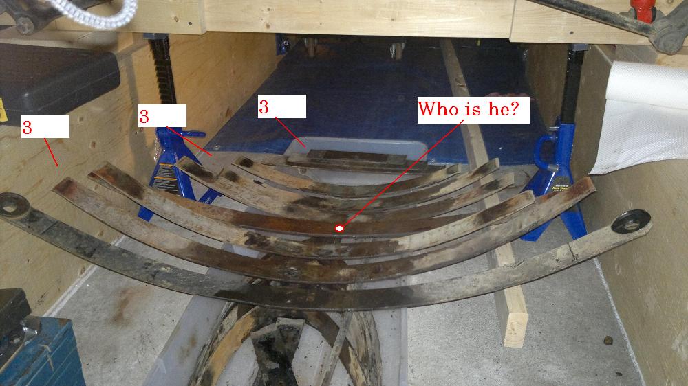 I was a little bit worried when it came to take off the leaf spring. It has got a high tension and I was afraid of breaking bones or crashing the car. But before I started this task I read articles and watched youtube videos about other people doing the same thing. In the end it is very, very important to use a good hydraulic jack to push up the leaf spring to take the tension of the rear spring bolts. The tension was so high that the right side of the car took off of the ramps! Because the leaf spring is not really a light weight component I also used the jack to hold it up when I realesed the leaf spring mounting bolts. As you can see at the pictures below it all worked out fine and the leafs are very, very dirty and greasy but appart from that in a good condition with just some little rust. |