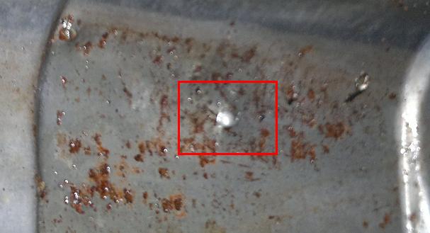Here comes the picture that hurts. From the inside showing the repaired spot. The little pump is some "repair" metal from the outside (click the image) I hope to repair the tank, or better, prepare it to last a few more years using the POR15 Fuel Tank Repair Kit which I just bought: |